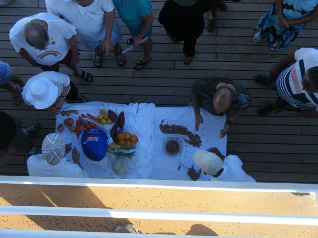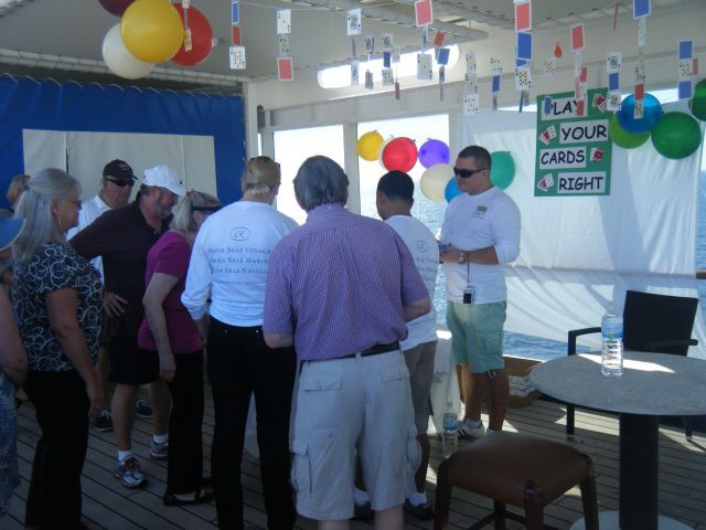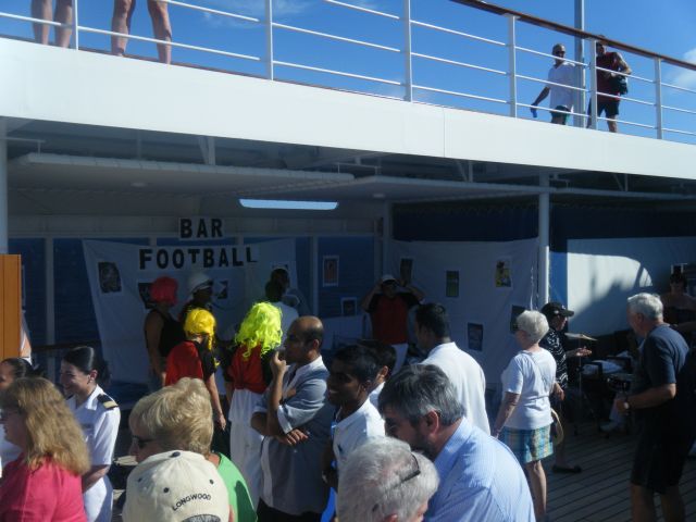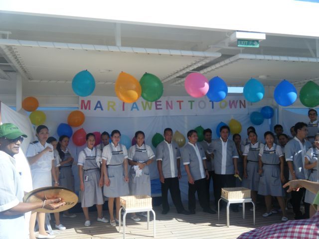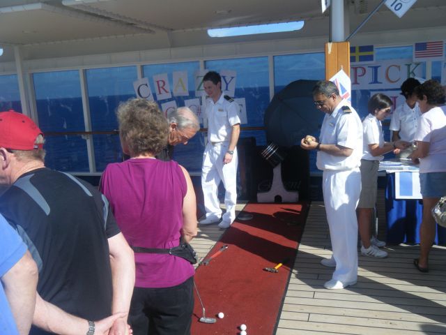 The seas were calm and it was sunny & hot for this sea day. In the afternoon there was a Regent Country Fair on the pool deck. Each of the ship's departments (housekeeping, bar, restaurant, engine room etc) had booths along both sides of the pool deck. They each had a game to play and winners at each one got a raffle ticket for a drawing at the end. The orchestra was playing and we had 45 minutes to collect as many tickets as we could. At the conclusion ticket numbers were drawn for prizes. The fairs are done on long segments with sea days and they are always fun. We had dinner with 2 other couples and listened to Stephanie Baldwin sing at the after dinner show.